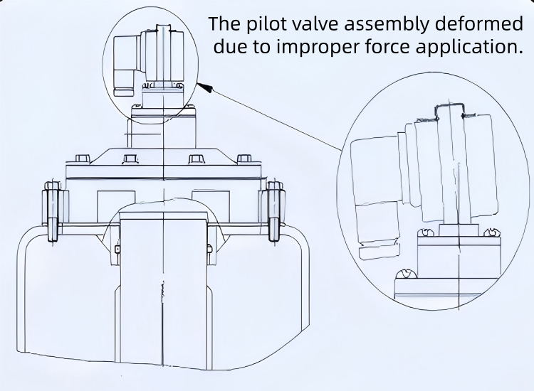 A beszerelés után a légtartályokon, a csatlakoztatott karimákon vagy a fúvócsöveken tilos hegesztési műveleteket végezni a hegesztési fröccsenés vagy a membránok magas hőmérsékletű károsodásának elkerülése érdekében. Óvatosan kezelje a szállítás vagy a telepítés során, hogy elkerülje a mágnesszelep vezérlőszerelvényének ütközési sérülését, amely deformálhatja az orsó hüvelyét, ami a mozgó szár elakadását és a szelep működését akadályozhatja.